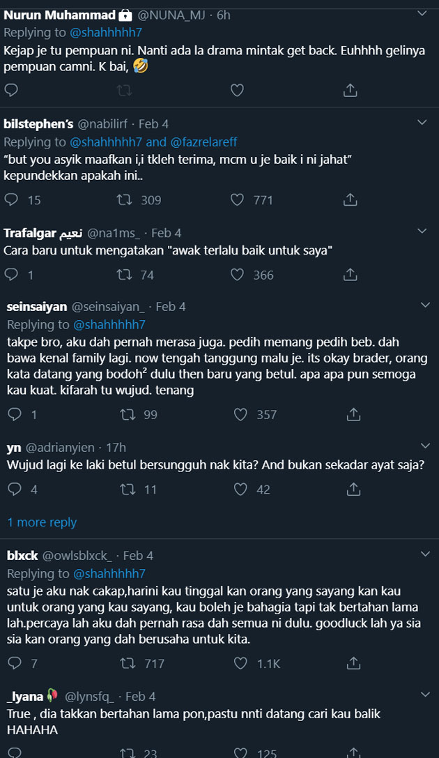 “Dua tahun lebih aku bazirkan effort aku kat perempuan ni. Last-last ini yang aku dapat. Macam-macam dah aku plan dengan dia. Hmmm. Menyesal aku bagi harapan tinggi kat dia. Ingatkan dia setia. **ndekkk,” tulis Shah di Twitter.