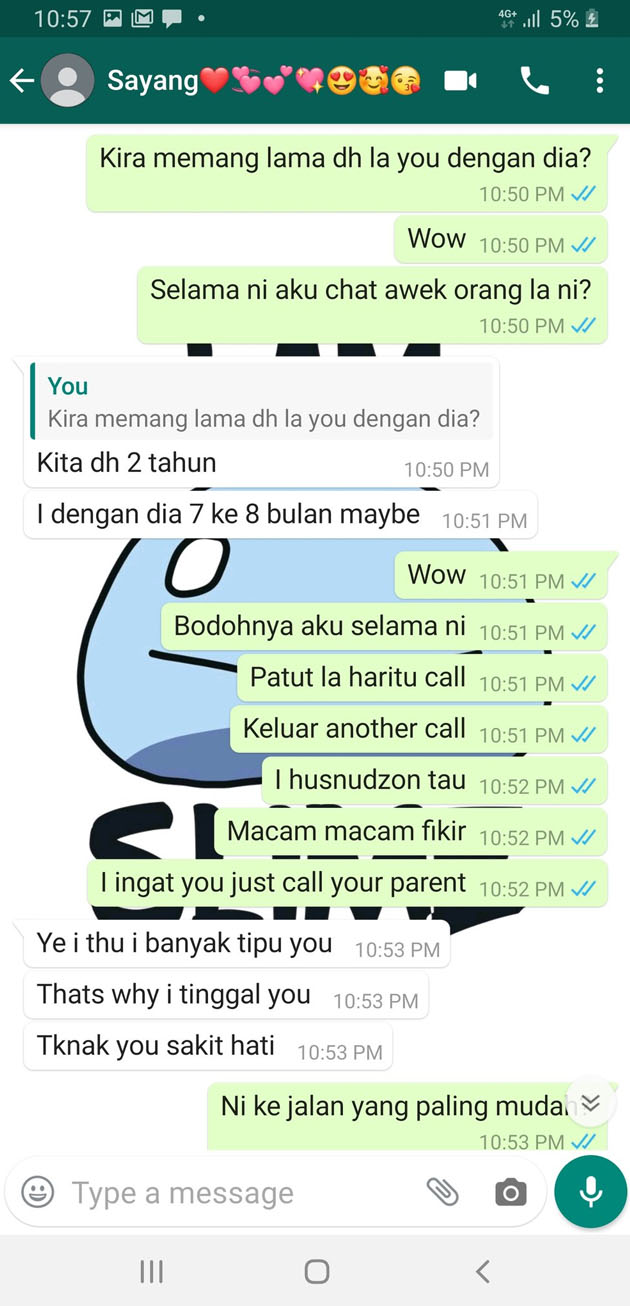 “Pape, thanks buat I bahagia. Btw, dia suruh I block you. Bye,” mesej terakhir dari perempuan itu.