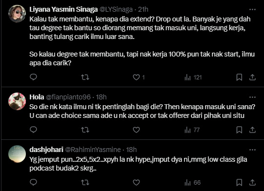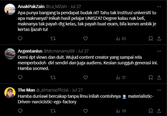 Menurut individu bernama DMA Islam atau nama sebenarnya, Danial Mirza berkata, “Degree ini tiada kaitan dengan aku punya goal dalam hidup. Aku tak nak kerja dengan orang, degree ini tidak akan membantu aku”.