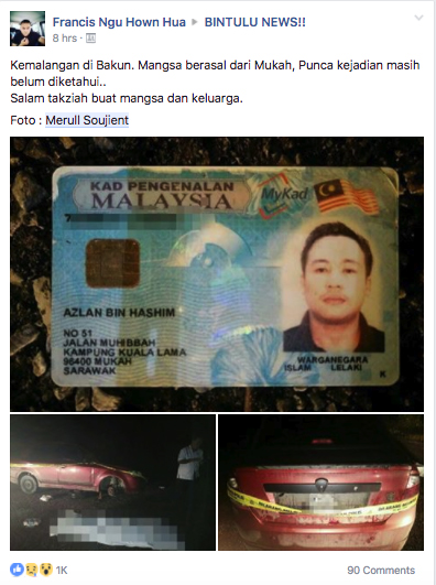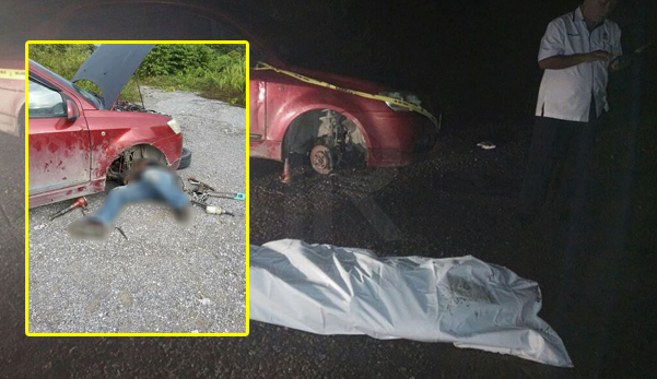 Dalam kejadian semalam di Bakun, Bintulu, mangsa, Azlan Hashim, yang berasal Kampung Kuala Lama, Mukah, sedang membaiki kereta Proton Saga berwarna merah.