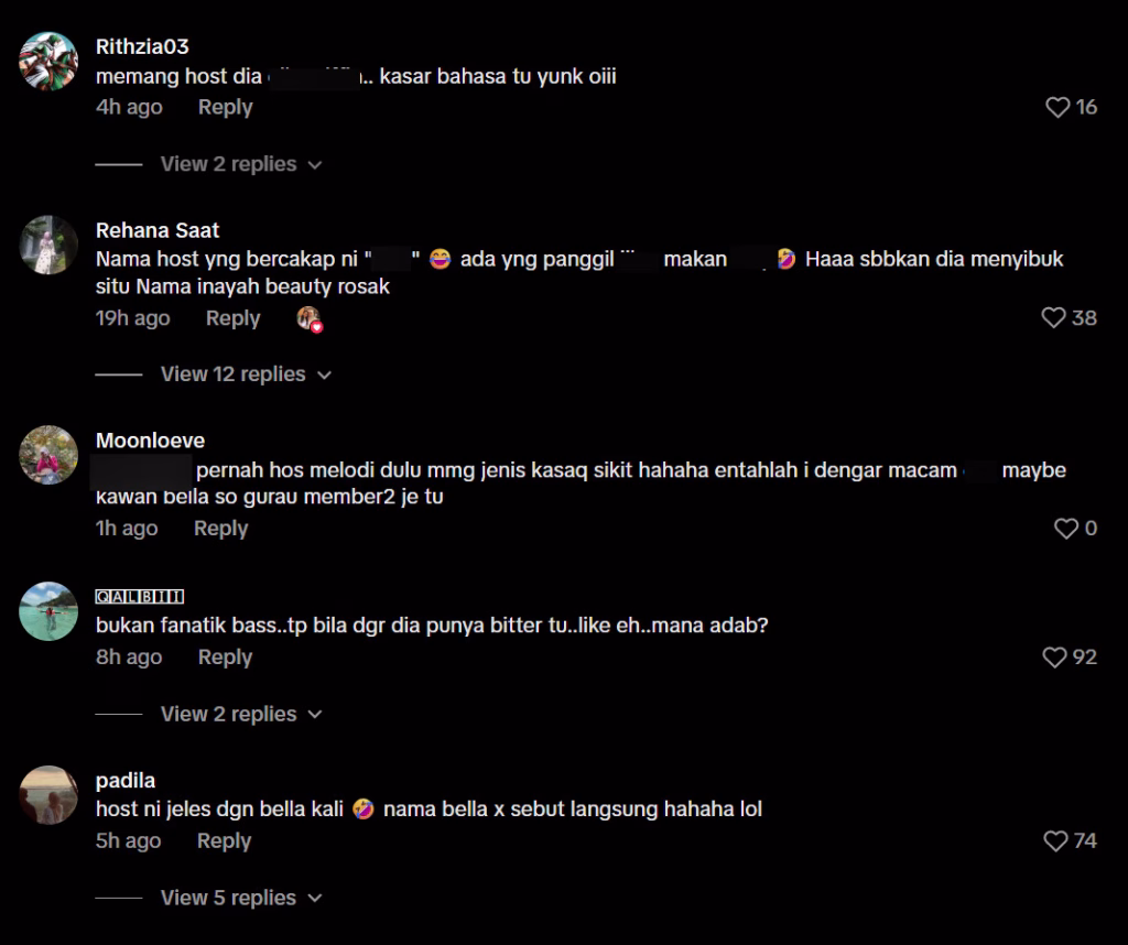 Dalam rakaman siaran langsung TikTok yang kini tersebar, seorang wanita yang juga figura dalam industri hiburan dilihat menyindir peminat yang ingin melihat “BASS” (singkatan popular merujuk kepada gandingan Bella Astillah dan Syed Saddiq) sambil mempersoalkan pemilihan pakaian Bella.