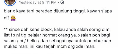 “Since dah kena block, kalau anda salah seorang dalam list Facebook ini, tolong belajar hormat orang ya. Tak salah pun bagi salam, hi, hello dan sebagainya untuk pembukaan mukadimah.