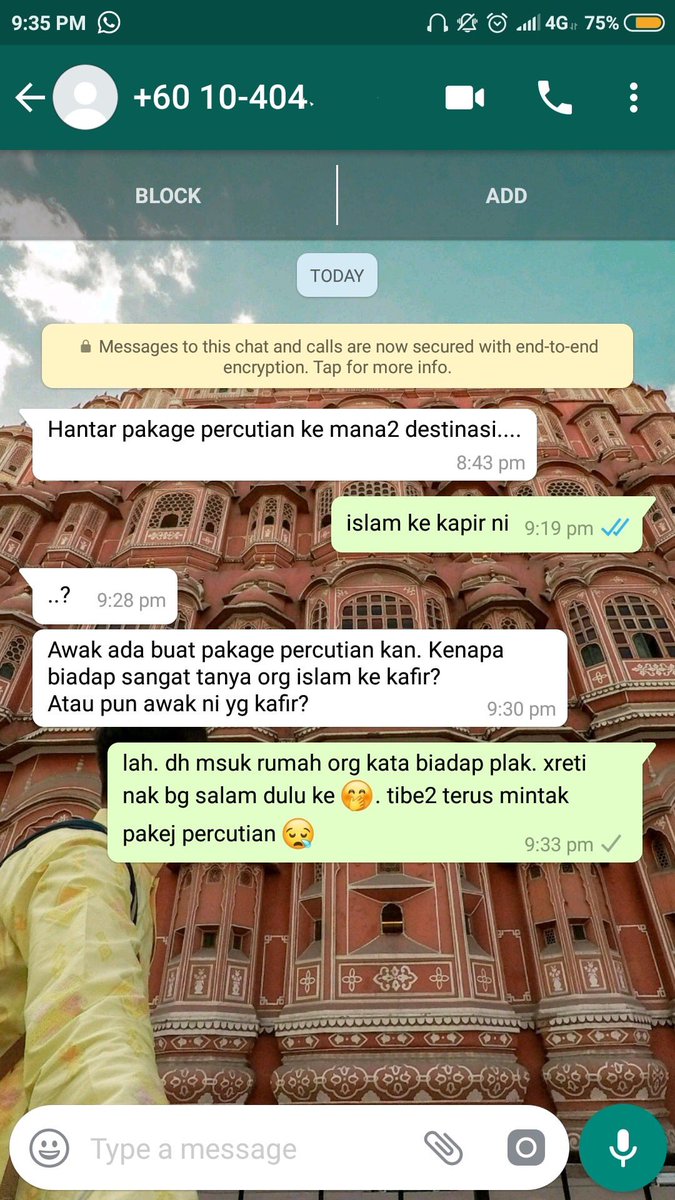 “Aku buat gak bisnes. Tapi kalau customer WhatsApp tanpa beri salam, so aku yang start beri salam atau hai. Benda kecil macam tu pun nak diperbesar-besarkan. Otak letak kat bontot ke?” – @NorDanialHaikal.