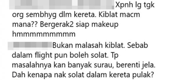 “Bukan masalah kiblat, sebab dalam flight pun boleh solat. Tetapi masalahnya kan banyak surau, berhenti sajalah. Dah kenapa nak solat dalam kereta pula?” soal netizen lain.