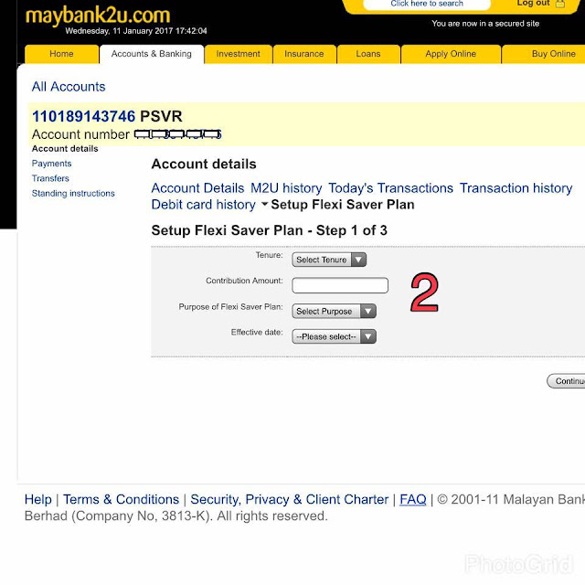 | Lepas tu pilih SETUP FLEXI SAVER PLAN. Select tenure tu (berapa bulan nak menabung) , Contribution amount ( letak lah RM50 – RM300) Tadi nak letak RM500 tapi tak dapat lak . so letak rm300. |