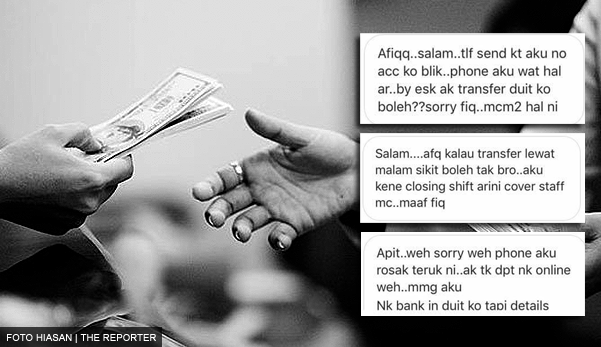 Katanya, dia terdesak dan bila dia terima gaji nanti dia akan akan bayar. Tak cukup nak lepas sampai gaji.