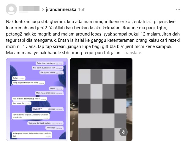 Seorang wanita meluah rasa kecewa dan bengang dengan tindakan jirannya, yang dikenali sebagai seorang influencer, kerap membuat siaran langsung (live) luar rumah dengan nada kuat sehingga mengganggu ketenteraman penduduk setempat. Menurutnya, jiran-jiran sekitar telah menyerahkan surat teguran tetapi usaha itu tidak membuahkan hasil.