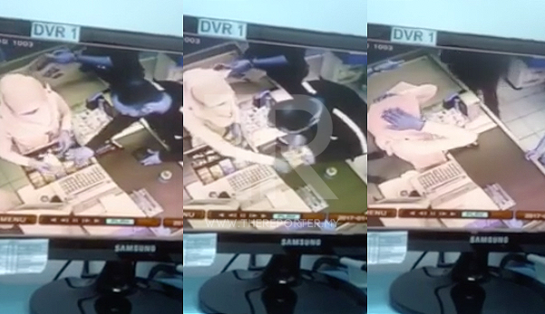 | Suspek berpura-pura membeli air minuman dan membuat pembayaran di kaunter mangsa |