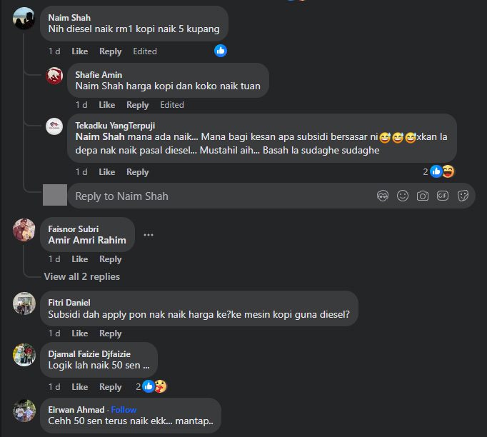 “Dan kami menaikkan harga jualan bukan disebabkan harga diesel yang naik. Kos bahan mentah semasa kami yang dah lama naik seperti susu, cawan plastik dan yang terbaru biji kopi dinaikkan harga oleh pihak pembekal kami,” katanya.
