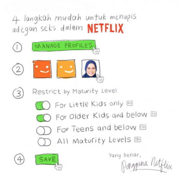 Bagi pengguna Netflix, ibu bapa sepatutnya tahu bahawa mereka boleh mengawal kandungan yang berunsur dewasa itu dari ditonton oleh anak-anak dengna membuat tetapan ‘parental control’ di bahagian setting aplikasi tersebut.