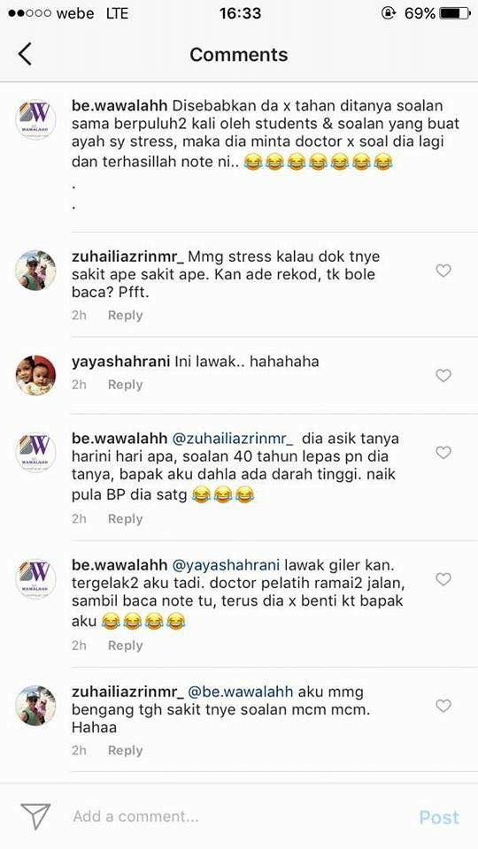 “@yayashahrani lawak giler kan. Tergelak-gelak aku tadi. Doktor pelatih ramai-ramai jalan sambil baca note itu. Terus dia tak berhenti kat bapa aku,” tulisnya pada ruangan komen.