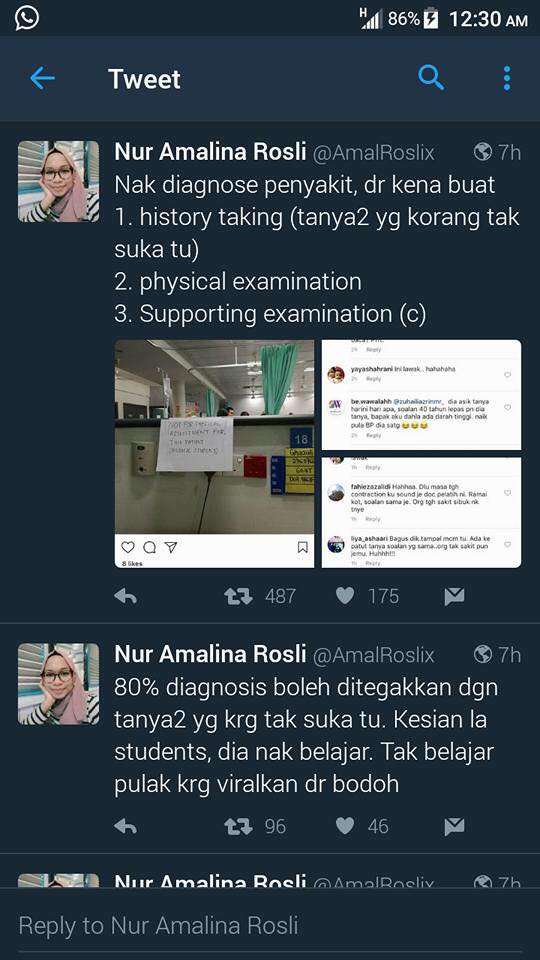 “Nak diagnose penyakit, doktor kena buat: history taking (tanya-tanya yang korang tak suka tu), physical examnination, supporting examination (c). 80 peratus diagnosis boleh ditegakkan dengan tanya-tanya yang korang tak suka itu. Kasihanlah students, dia nak belajar. Tak belajar pula, korang viralkan ‘Doktor Bodoh’.