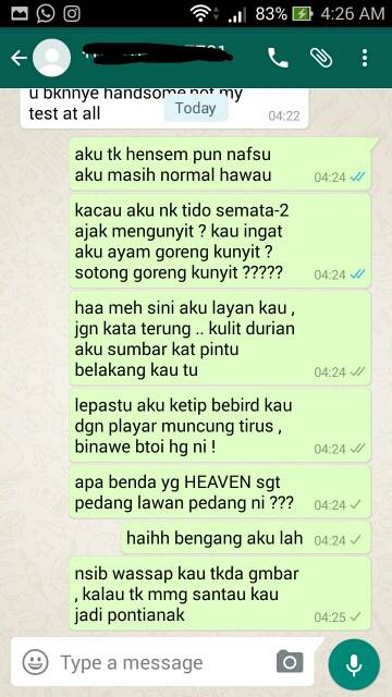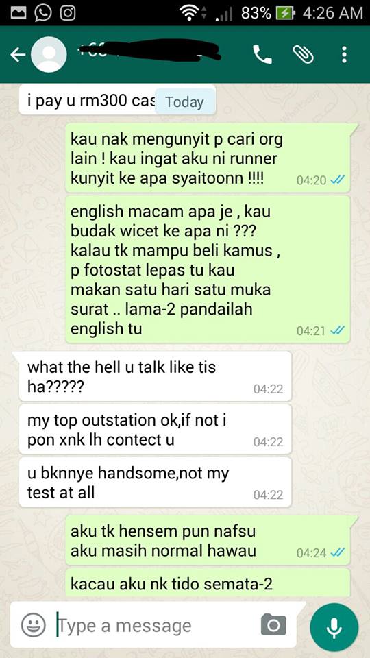“WhatsApp aku pagi-pagi buta semata-mata untuk? Tolonglah jangan nodai aku. Aku hanya runner yang lemah. Tolonglah jangan suruh saya runner benda pelik-pelik seperti ini,” katanya.