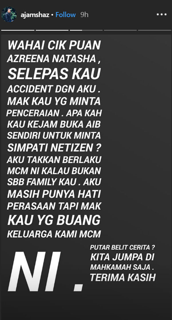 “Wahai cik puan Azreena Natasha, selepas kau accident dengan aku, mak kau yang minta perceraian. Apakah kau kejam buka aib sendiri untuk minta simpati netizen.