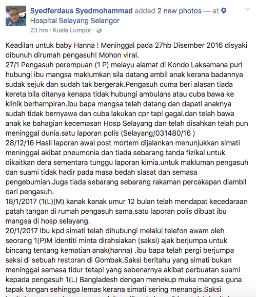 Bagaimanapun, dalam perkembangan terkini yang didedahkan oleh bapa saudara mangsa, Syedferdaus Syedmohammad, mangsa, Nur Hanna Nasuha binti Hafiz disyaki dibunuh di rumah pengasuh.