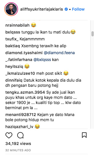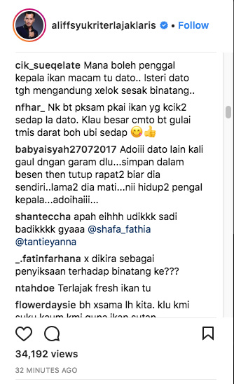 Di ruangan komen, netizen terkejut dan mempersoalkan mengapa Aliff tidak menunggu ikan itu mati terlebih dulu. Netizen juga menyifatkan perbuatan Aliff itu sebagai menyeksa binatang dan meminta jutawan kosmetik itu berfikir dulu sebelum berbuat apa-apa kerana isterinya sedang sarat mengandung.