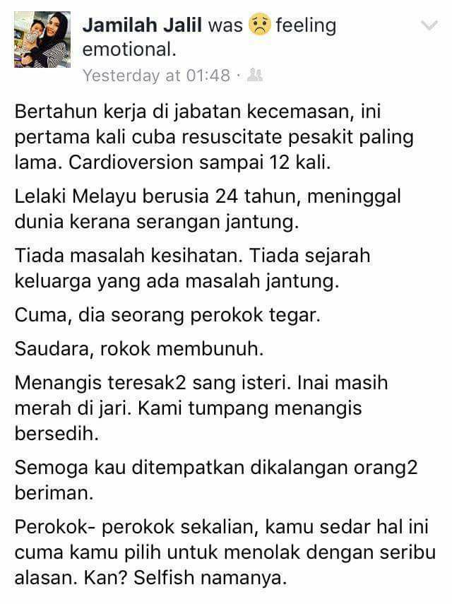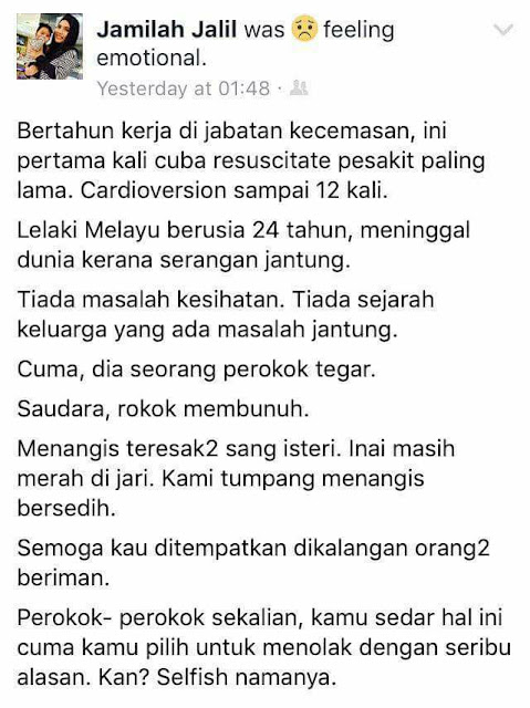 Dia perokok semasa hayatnya. Memang ajal maut itu Allah juga yang Maha Mengetahui tetapi, rokok itulah meragut nyawanya!