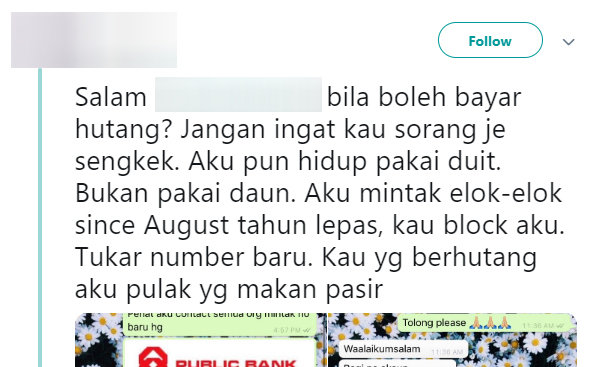 “Aku minta elok-elok since August tahun lepas. Kau block aku, tukar number baru. Kau yang berhutang, aku pula yang makan pasir,” tulisnya yang juga melampirkan dua screenshot perbualan WhatsApp di antara mereka.