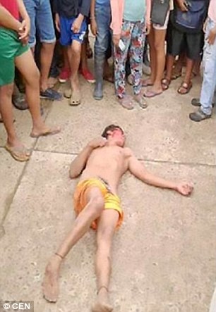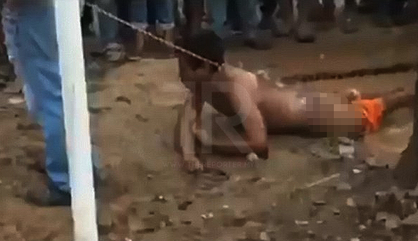 Mereka kemudiannya membelasah lelaki itu yang hanya memakai seluar pendek secara beramai-ramai dan mengheretnya ke jalan raya sebelum digantung sehingga mati pada sebatang pokok.