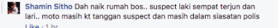 Laporan polis telah dibuat pada hari kejadian dan menurut Shamin, mereka telah menyerbu kediaman suspek. Bagaimanapun suspek lelaki sempat terjun dan melarikan diri.