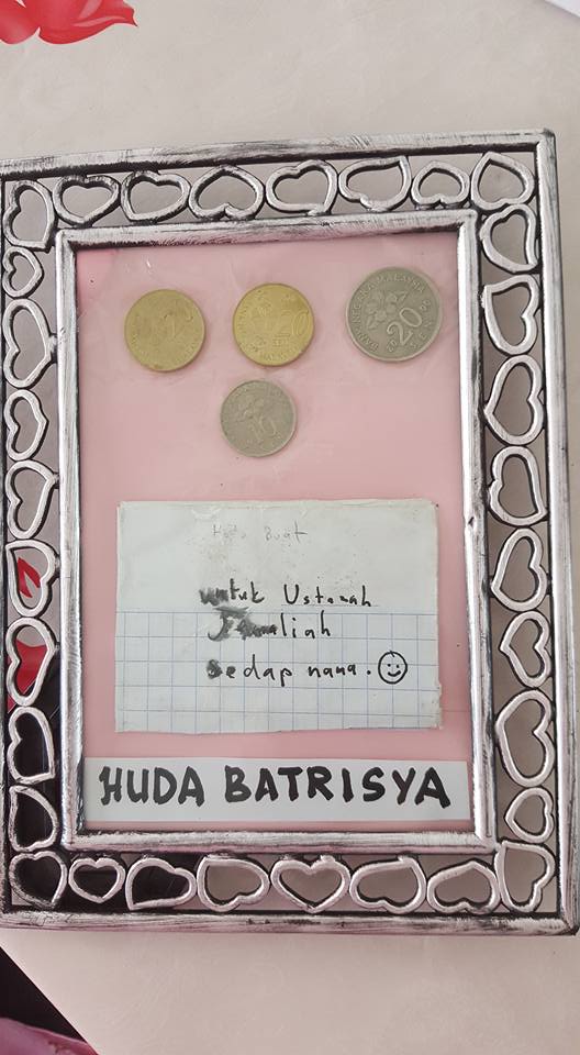 “Ustazah sangat terharu dan terfikir, ustsazah baru awal tahun 2017 mengajar Huda. Ada ramai lagi guru-guru pagi dan guru-guru petang yang lain untuk kamu berikan hadiah. Tetapi kamu pilih ustazah. Ustazah menangis fikirkan kamu beri ustazah duit syiling dari tabung kamu sendiri,” jelas saya.