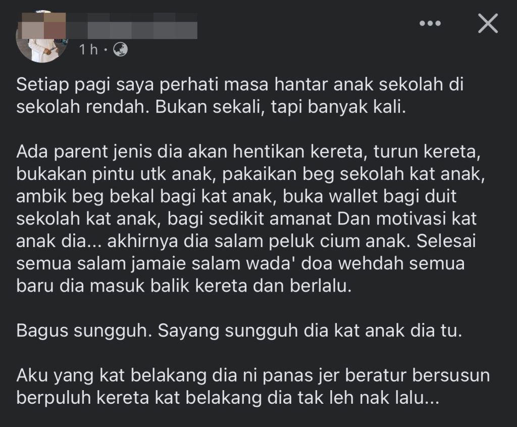 “Ada parent jenis dia akan hentikan kereta, turun kereta dan bukakan pintu untuk anak. Kemudian pakaikan beg sekolah kat anak, ambil beg bekal bagi kat anak. Buka wallet bagi duit sekolah kat anak, bagi sedikit amanat dan motivasi kat anak dia.