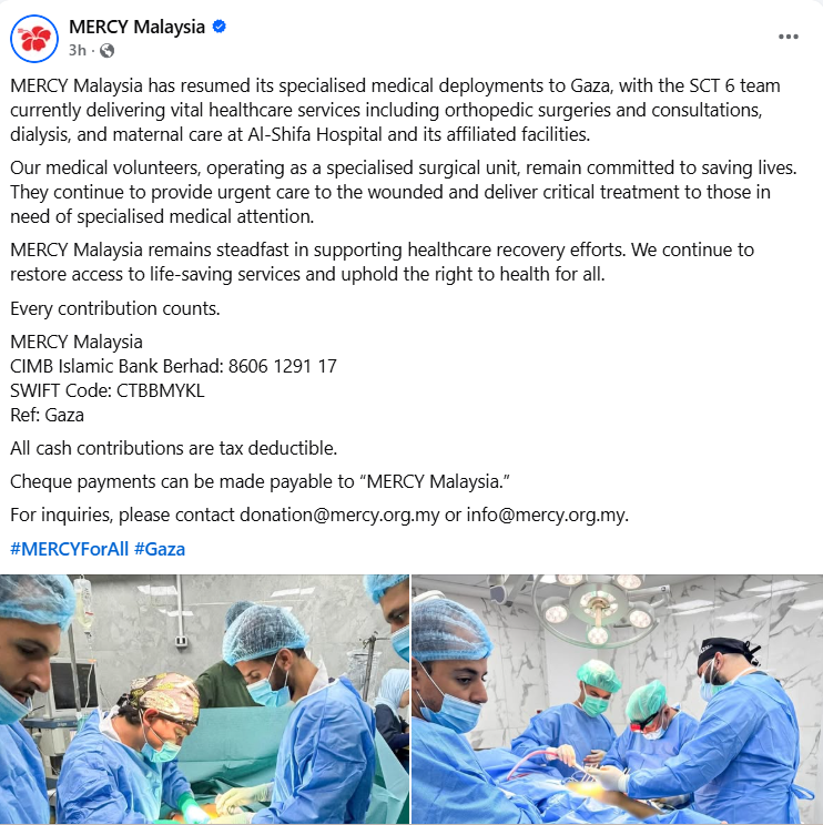 Dalam keadaan mencabar itu, MERCY Malaysia meneruskan komitmennya membantu rakyat Palestin melalui pasukan khas Specialised Care Team (SCT 6) yang kini beroperasi di barisan hadapan bagi menyalurkan bantuan perubatan dan kemanusiaan penting kepada mereka yang terjejas.