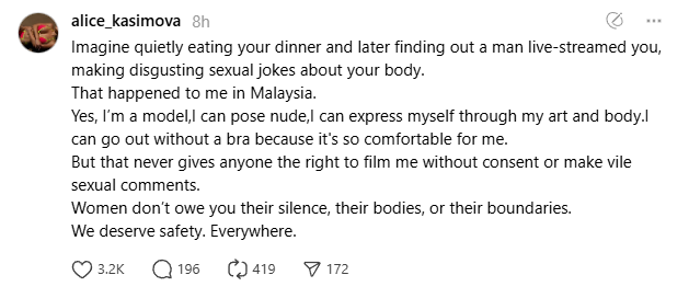 “Bayangkan sedang makan malam dengan tenang, kemudian mengetahui ada lelaki yang menyiarkan video secara langsung sambil membuat lawak jijik tentang tubuh anda. Itu yang berlaku kepada saya di Malaysia.