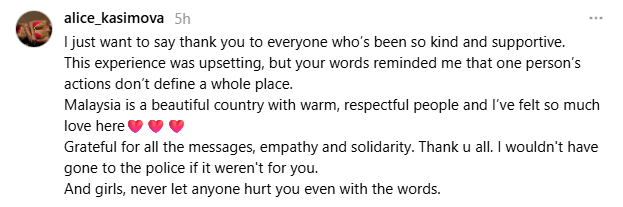 “Pengalaman ini memang mengecewakan, tetapi kata-kata kalian mengingatkan saya bahawa tindakan seorang individu tidak mewakili seluruh tempat.