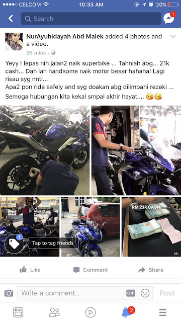 Untuk memudahkan dia nak bekerja, aku belikan dia R25 secara cash atas nama dia. Sebulan dua dia okey. Tiba-tiba kami bergaduh, dia berhenti kerja dari Bank Rakyat 24 jam. Aku pujuk, bagi semangat dan rasa bersalah sebab dia berhenti kerja selepas bergaduh dengan aku. Dia kata dia tak ada semangat dah bila orang cakap dia pendek akal.