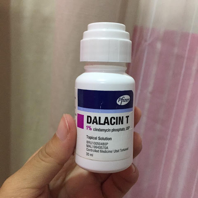 Bab cuci muka ini paling penting sebab kalau muka tak bersih, susah nak terima produk yang kita pakai. Kemudian pakai Dalacin T (area jerawat sahaja). Selepas itu pakai moisturizer sebab adakalanya Dalacin T ini boleh menyebabkan kulit muka kering. Tetapi disebabkan kulit saya jenis kulit berminyak, jadi tak adalah masalah itu.