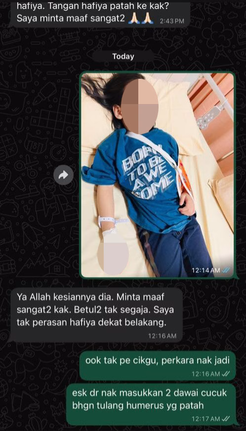 “Assalamualaikum kak. Saya minta maaf sangat-sangat. Kejadian yang menimpa Hafiya pagi tadi, saya tak sengaja. Saya tak perasan Hafiya ada dekat belakang saya. Bila saya nak pusing, Hafiya pegang kaki saya, terus saya tak boleh kawal badan dan terjatuh atas Hafiya. Tangan Hafiya patah ke kak? Saya minta maaf sangat-sangat.”