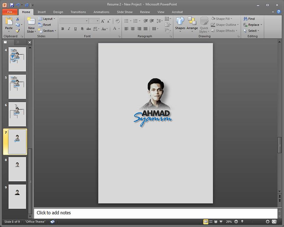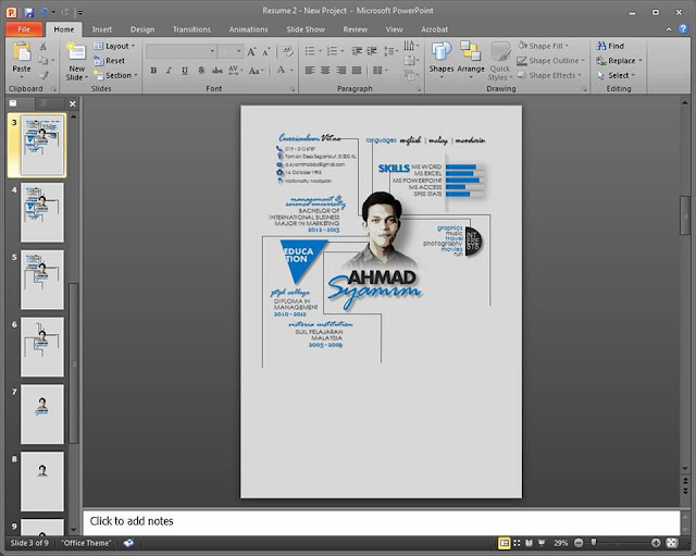 Seronok rasanya jual resume ini. Walaupun tak banyak mana, tetapi puas hati rasanya bila pelanggan juga berpuas hati dengan design yang dibuat menggunakan Powerpoint ini.