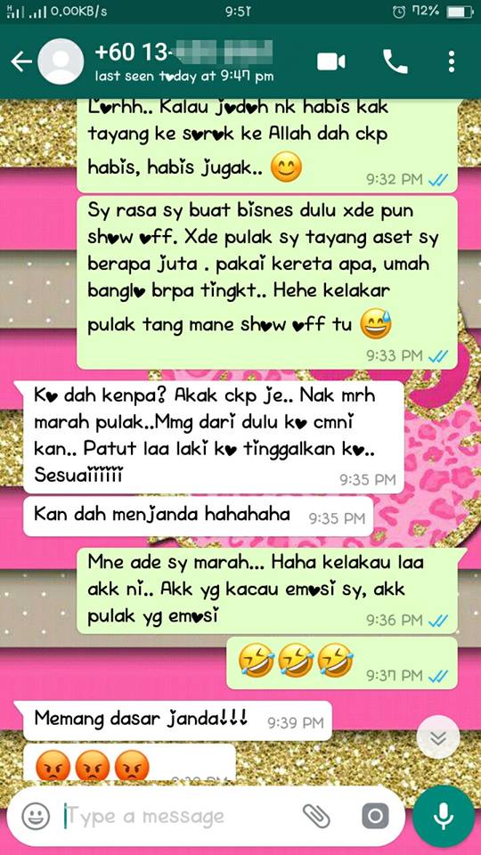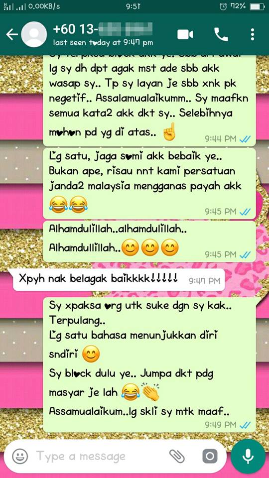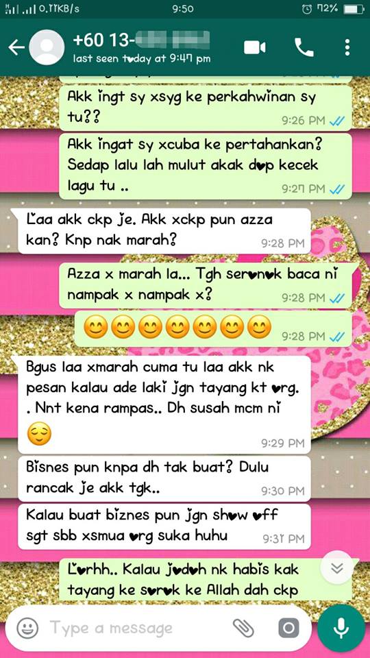 “Hmmm, betullah mak cakap manusia ini rambut saja hitam, tapi hati lain-lain. Mula-mula mesej di WhatsApp, elok saja. Last-last melencong ke lain dan nampak dah apa niat dia yang sebenarnya.