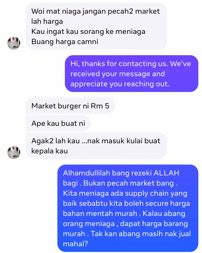 Zack mendakwa dirinya menerima mesej kecaman daripada individu tidak dikenali yang marah kerana dia menjual burger pada harga lebih rendah daripada kebanyakan peniaga lain. Individu itu mendesaknya supaya tidak menurunkan harga sehingga mengganggu rezeki peniaga lain, dan turut memberi bayangan agar dia tidak datang berniaga di kawasan tersebut.