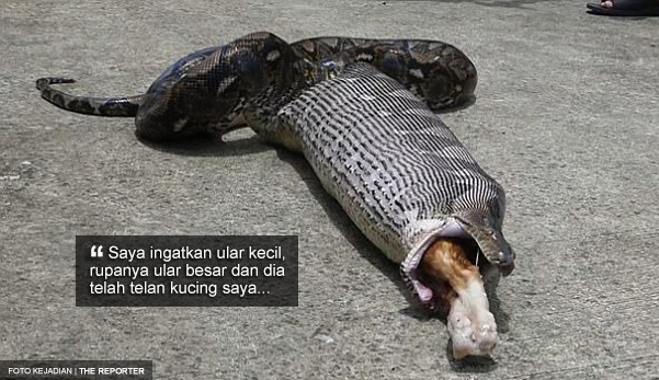 Lapor Daily Mail, ular itu telah menelan seekor kucing yang dinamakan sebagai Bobo selepas ia menyelinap masuk ke rumah pemiliknya di Pathum Thani, pagi Rabu.