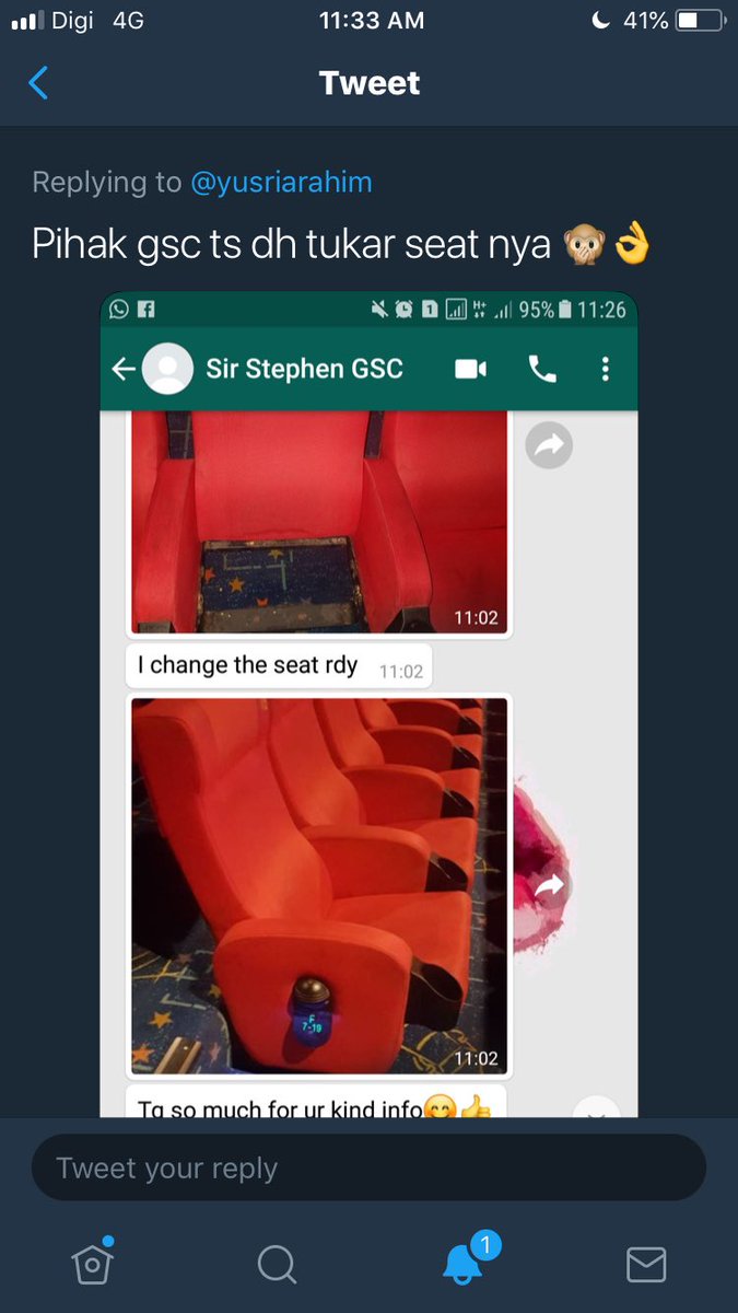 Susulan viralnya tweet itu, pihak GSC telah mengambil tindakan dengan menukar kusyen tempat duduk tersebut dengan yang baru.
