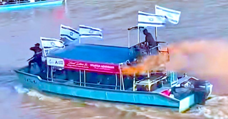 Bot dengan beberapa bendera Israel dikibarkan di atas air semasa persembahan gimik Program Solidariti Gaza di Kelantan.