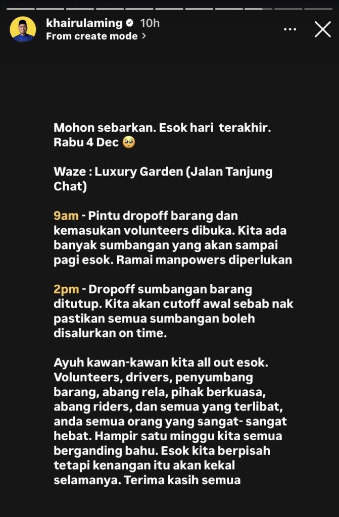 Dalam pada itu, Khairul Aming turut memaklumkan hari ini (Rabu) merupakan hari terakhir misi banjir di Kelantan.