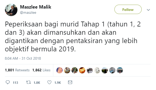 Menteri Pendidikan, Dr. Maszlee Malik, melalui Twitternya berkata, peperiksaan bagi tiga tahap itu akan dimansuhkan dan digantikan dengan pentaksiran yang lebih objektif.