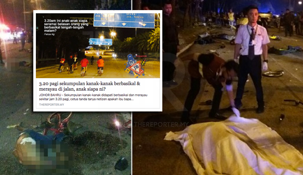 JOHOR BAHRU – Sembilan remaja maut, manakala empat lagi parah apabila basikal yang ditunggang mereka dirempuh sebuah kereta di Jalan Lingkaran Dalam, awal pagi tadi.