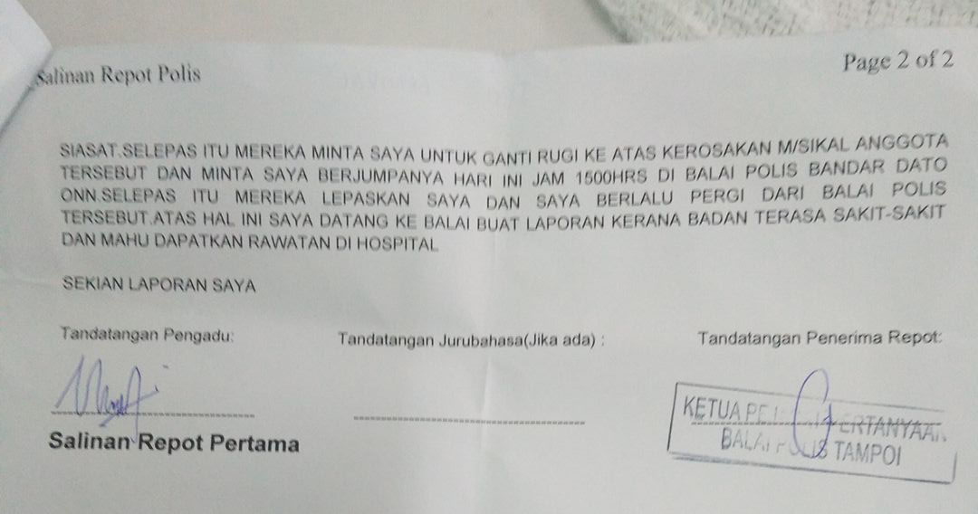 “Saya kemudian diminta ke Balai Polis Bandar Dato Onn. Saya dibawa ke satu bilik untuk disoal siasat. Mereka meminta saya membayar ganti rugi ke atas kerosakan motosikal anggota terbabit dan meminta saya berjumpa dengannya hari ini (semalam) jam 5 petang di Balai Polis Bandar Dato Onn sebelum saya dibebaskan.” tulisnya dalam laporan tersebut.
