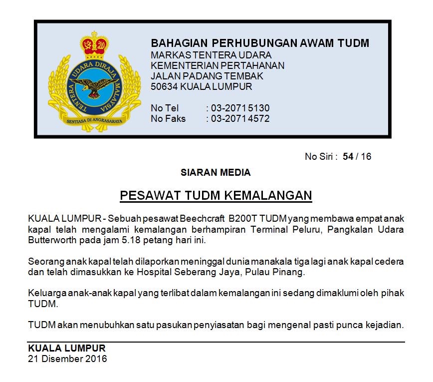 BUTTERWORTH, PULAU PINANG – Seorang Juruterbang Tentera Udara Diraja Malaysia (TUDM) maut, manakala tiga lagi cedera selepas pesawat yang dinaiki mereka terhempas di Pangkalan TUDM, hari ini.
