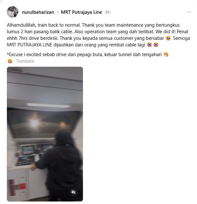 “Alhamdulillah, train back to normal. Thank you team maintenance yang bertungkus lumus dua hari pasang balik cable. Also operation team yang dah terlibat. We did it! Penat ehhh 7 jam drive berdiri. Thank you kepada semua customer yang bersabar. Semoga MRT Putrajaya Line dijauhkan dari orang yang rembat cable lagi,” katanya dalam satu perkongsian di media sosial.