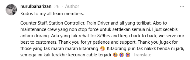 “Kudos to all my team members counter staff, station controller, train driver dan semua yang terlibat. Juga kepada maintenance crew yang non-stop force untuk settlekan semua ni. Saya cuma secebis antara mereka. Ada yang tak rehat 8-9 jam dan kerja back to back. We serve our best to customers,” ujarnya.