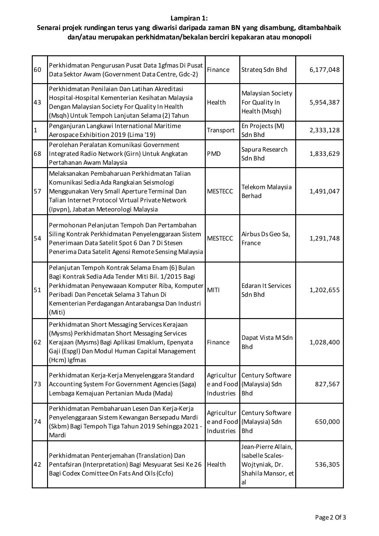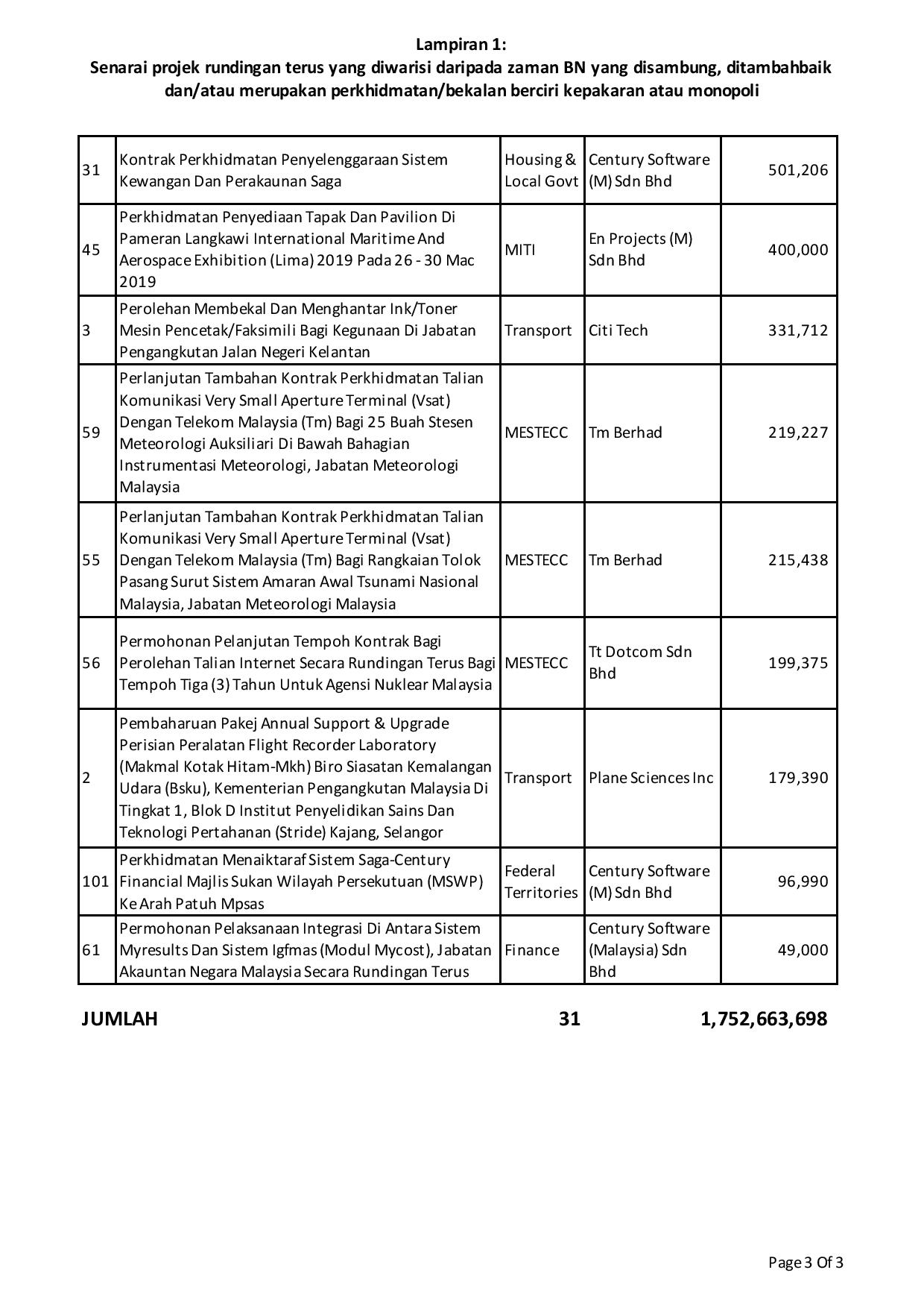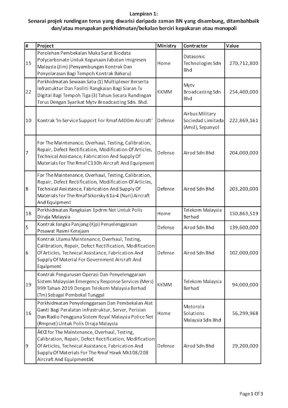 BERIKUT SENARAI PROJJEK YANG DIDAKWA DIWARISI DARIPADA BN YANG DISAMBUNG ATAU DITAMBAH BAIK SERTA BERCIRIKAN KEPAKARAN KHAS ATAU MONOPOLI: