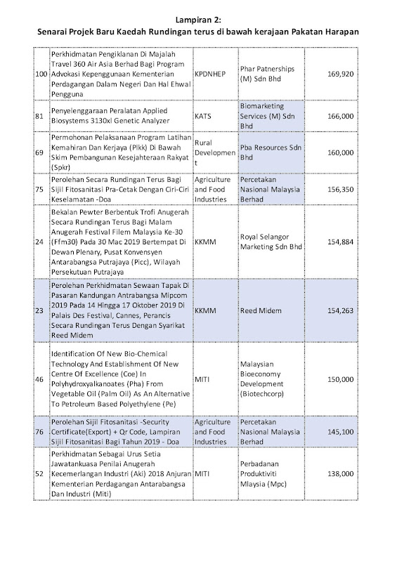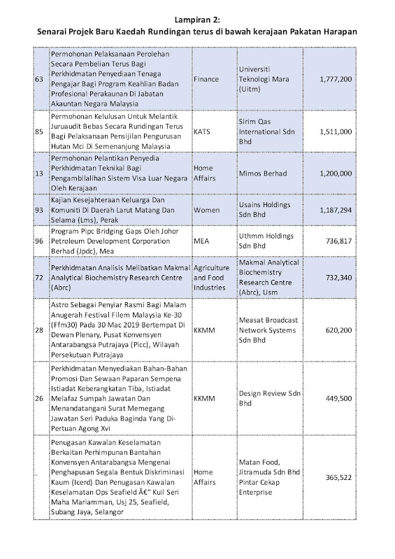 Semalam, Kementerian Kewangan (MoF) mengeluarkan senarai 101 projek rundingan terus bernilai RM6.61 bilion yang didakwa dilakukan oleh Kerajaan Pakatan Harapan (PH) sebelum pucuk pimpinan kerajaan bertukar tangan.