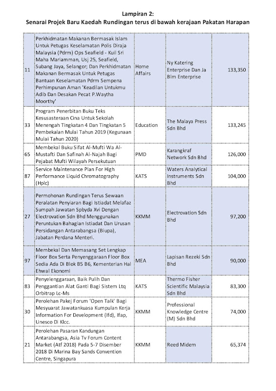 Projek rundingan terus di era PH hanya bernilai RM352 juta atau 0.07 peratus daripada nilai keseluruhan perolehan kerajaan (RM447.38 bilion), yang melibatkan keperluan mendesak seperti perbekalan buku teks sekolah oleh Dewan Bahasa dan Pustaka (DBP) dan operasi pembasmian kecemasan wabak rabies di Sarawak.