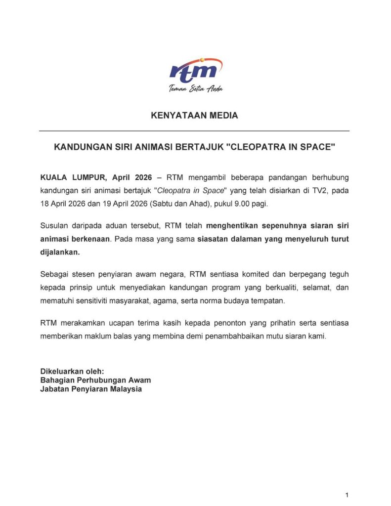 RTM turut menegaskan komitmennya sebagai stesen penyiaran awam negara untuk terus menyediakan kandungan yang berkualiti, selamat dan selaras dengan sensitiviti masyarakat, agama serta norma budaya tempatan.