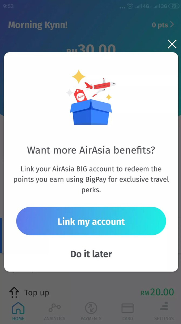 Langkah 7 : Dah terima kad, aktifkan kad dan linkkan juga akaun BigPay korang dengan akaun AirAsia Loyalty Big Point. Sebab banyak lagi faedah yang korang boleh dapat dari setiap transaksi yang di buat.